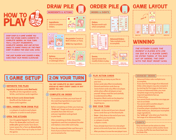 Overcooked – Target player discards a completed Order from their score pile and loses the money for it. This card works on Advanced Orders too.